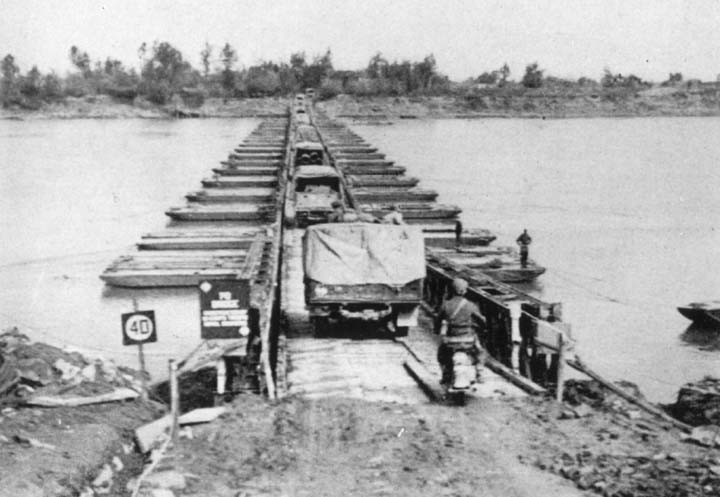 | 4 Field Ambulance trucks cross the Po. (A. W. Owen-Johnston