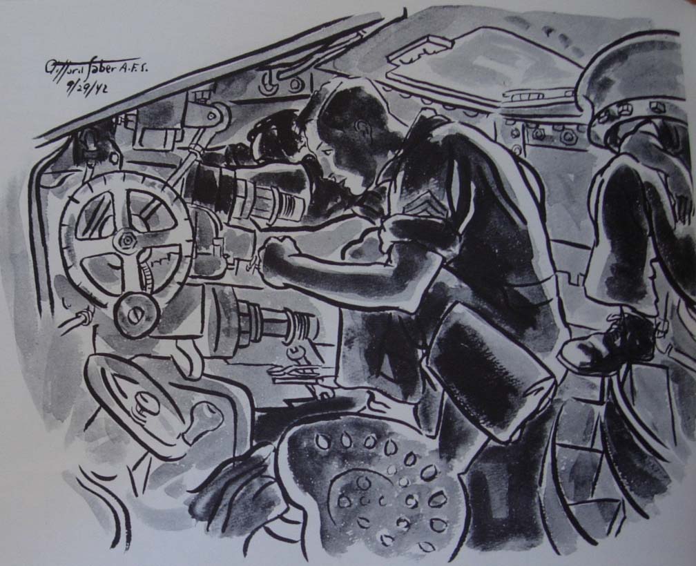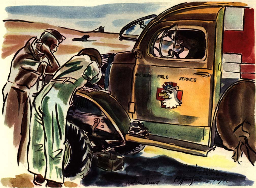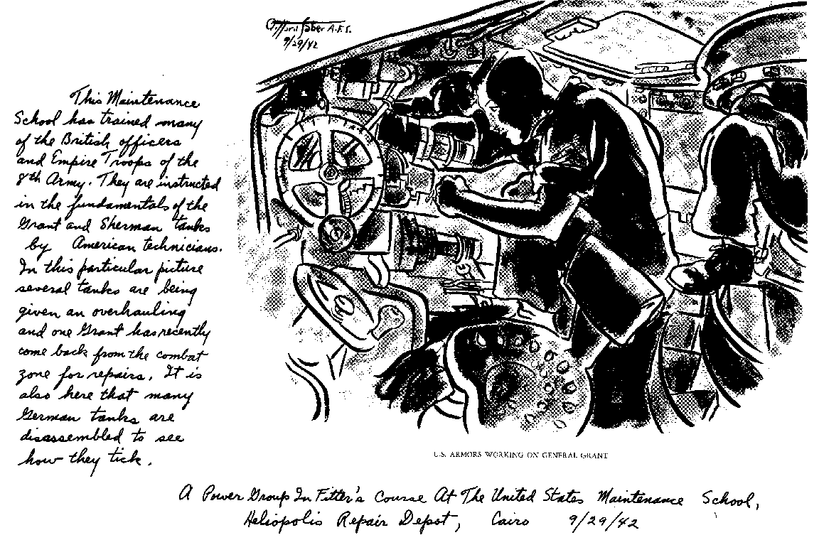 Since I still had free time before joining my outfit which was on its way to the Western Desert, I sketched the American tank-maintenance depot at Heliopolis for the army and OWI. The latter lacked an American art director at the time and was expecting one en route from the States momentarily. I retained two of the paintings and the rest were used for promotional purposes.