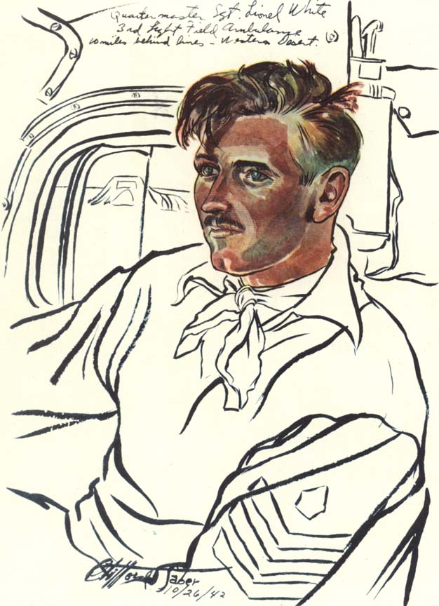 Typical were Quartermaster Sergeant Lionel White and Staff Sergeant Reginald Jenson of the 3rd Light Field Ambulance Unit while we were attached to their outfit. To us, they were Whitey and Baron and they became part of the coffee-drinking Kids, participating in our poker-game cutups and being initiated into baseball. To pinpoint their personalities would be to say Whitey resembled Clark Gable and Baron, James Cagney. I painted both of them.