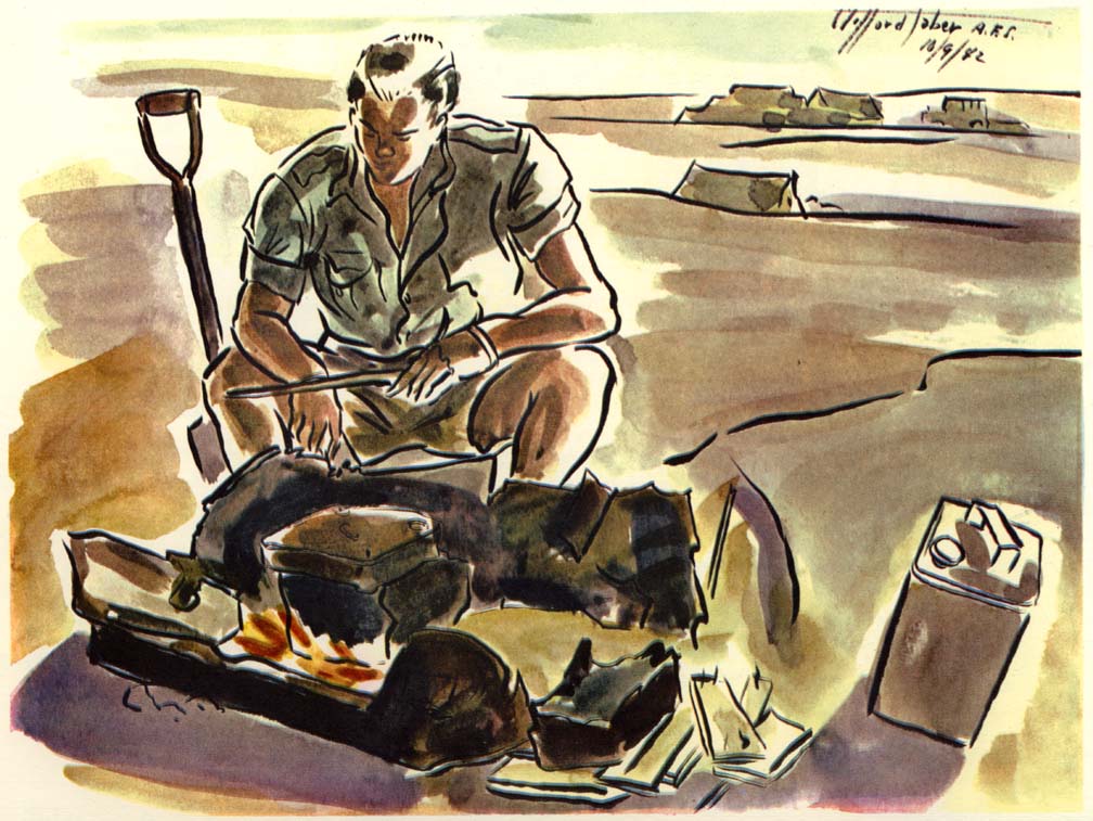 With the toilet over, I occasionally sketched before breakfast, which consisted of American bacon, marmalade, margarine, thick army biscuits, and the inevitable tea, the basic drink of the 8th Army. It was a strong yellow even if milk was added to it. Always full of the taste of petrol, oversweet, insipid, but with no flavor of tea, it was the old stand-by --- "When in doubt, brew up!"