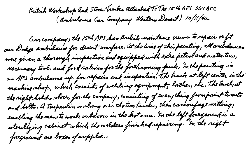 Late in the afternoon we found the company leaguered off the road at a point known as Kilo 121 which became our camp site for the next three weeks. The area was clean and of soft sand. The cooks had set up their kitchen. Swill pits and latrines had been dug and desert roses (two four-gallon tins planted in a sand hole for a urinal) were marked. Workshop trucks had been set up and camouflaged. As the ambulances were dispersed, I found myself as Hazy's spare driver, living in his ambulance in the suburbs away from the center of camp, a good half-mile walk to mess and a longer walk for subject matter to paint.