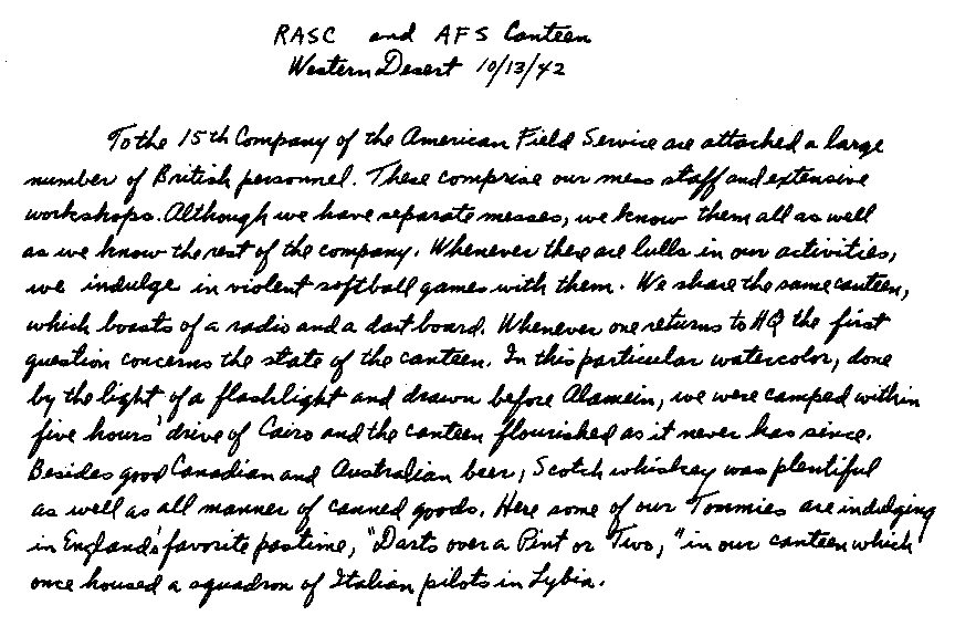 After some enthusiastic greetings, talk of home, and war rumors, we were shown our barracks: Each man was handed a set of mimeographed sheets which combined information about the AFS in the Middle East and the 11th AFS Ambulance Car Company active in the field in Syria and the Western Desert. As we read this information, an AFS cashier arrived in camp to supervise the first of the monthly payments to the new men and to handle other monetary matters. We were told by our officers to buddy-up and grab an EPIP (English patent Indian product), a tent which would house eight men including a desert-veteran NCO. My gang (the "Dead-End Kids") from aboard ship was split up temporarily but soon reunited after the housing problem was solved.