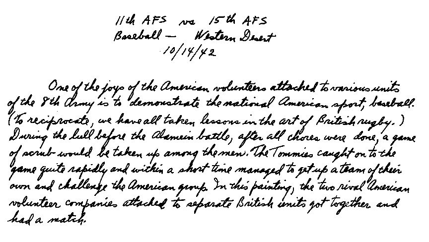 11th Company challenged the "Chickens" to a series of baseball games. The competition included British personnel of both companies. With Whitey, Baron, and a couple of cooks, we won six games out of ten. We won four straight games, coming from behind in the last two. In the last game, in the last inning we scored four runs to win. While we were at bat, I did a quick color sketch of the game and then went out to left field to catch fly balls.