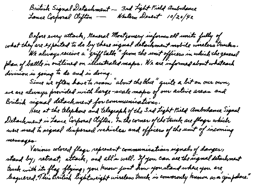 When the meeting was over, Major Benson informed me that a new ambulance car company of over a hundred ambulances was being formed while 11th Company still operated in the battle area. Although I had had eight months of infantry soldiering at Fort Benning, Georgia, there was an important difference between that and driver training in the desert under combat conditions; the latter was something to be learned not by verbal instruction or lectures but by experience. My leave was postponed till after this training was completed.