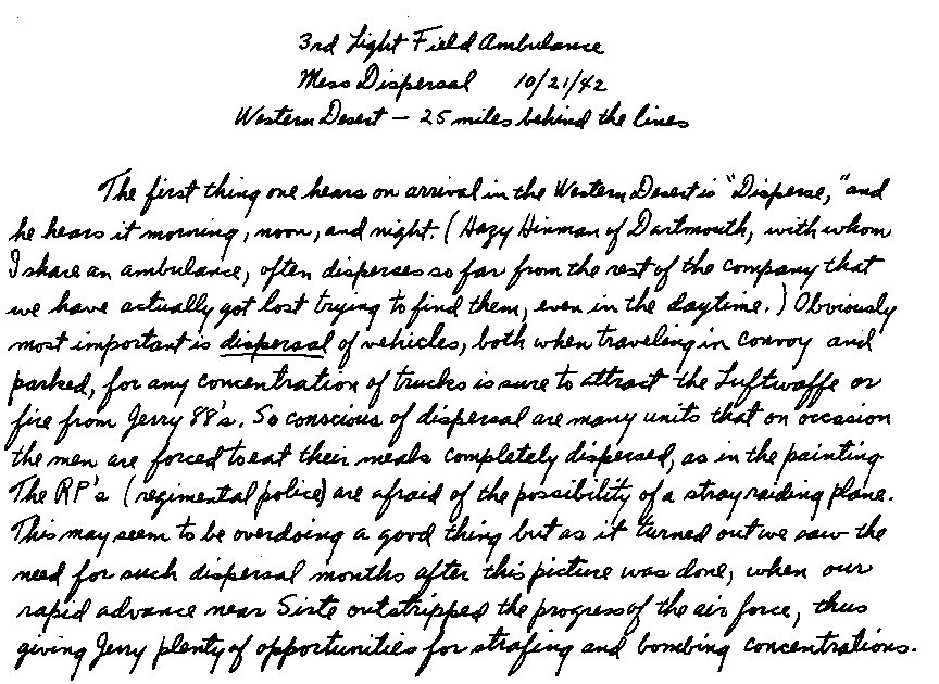 Training each day on the old battlefield of Tel el Kebir where the British defeated Arabi Pasha's forces in 1882, we gathered for lectures on navigation and convoy driving, ambulance maintenance, the British army medical system, army Bedouin life, and land mines. And each day with college-type cramming, trial method and practice, we mastered the contents of these lectures which were given by English and American veterans. This all-important know-how involved not only the safety of our lives but, most important, the lives of the transported wounded.