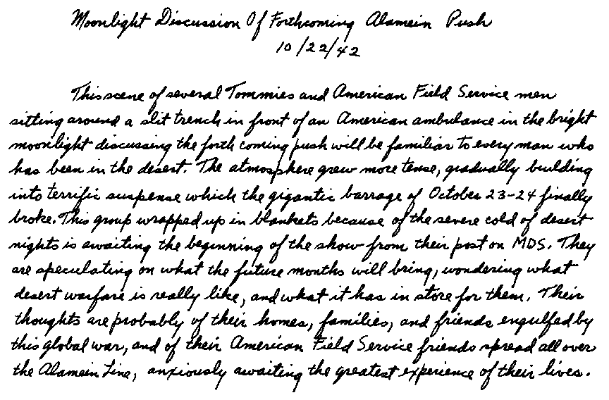 Like Bedouins, some draped blankets over their summer khaki and we sat around a slit trench on its mounds and leaned back against the ambulance which protected us from the wind. An almost full moon came up with a brightness clear enough to read by. Everyone cupped their cigarettes, shielding the glowing tip from any enemy patrol or plane. Montgomery's last words, "Good hunting," were passed along the line for tomorrow's "do," and it became a departing trade-mark. According to the stories circulated, some of our men had already been captured and we wondered if we would be caught in the bag. Talk of Benghazi four hundred miles away was the main topic. Twice the 8th Army had gone there and twice it had been hurled back. The first time was in 1940 and the second at the end of 1941. The Benghazi Arabs almost came to expect them yearly, and their children chanted, "Mungara, quoice quittir--- El Englesi come but once a year."