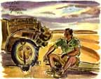 I kept a watchful eye on the whereabouts of my portfolio; so did the rest of the gang. Despite all the scrounging that soldiers do, not one painting was rifled en route or throughout the desert chase that ensued --- although somebody did swipe two egg-laying hens that "Wee Wee" Schorger and I owned jointly.