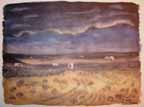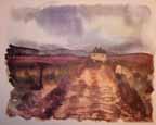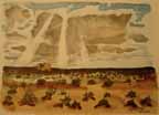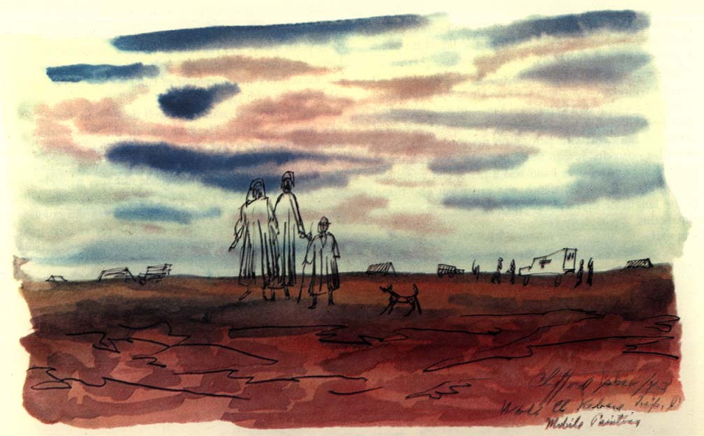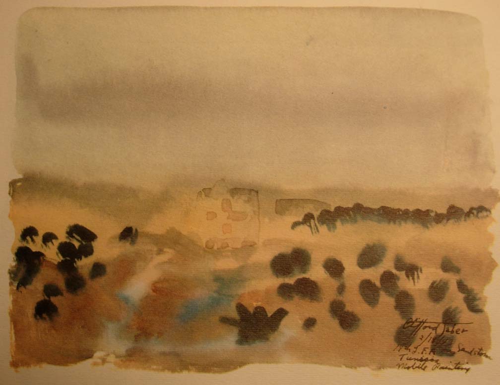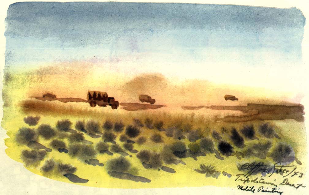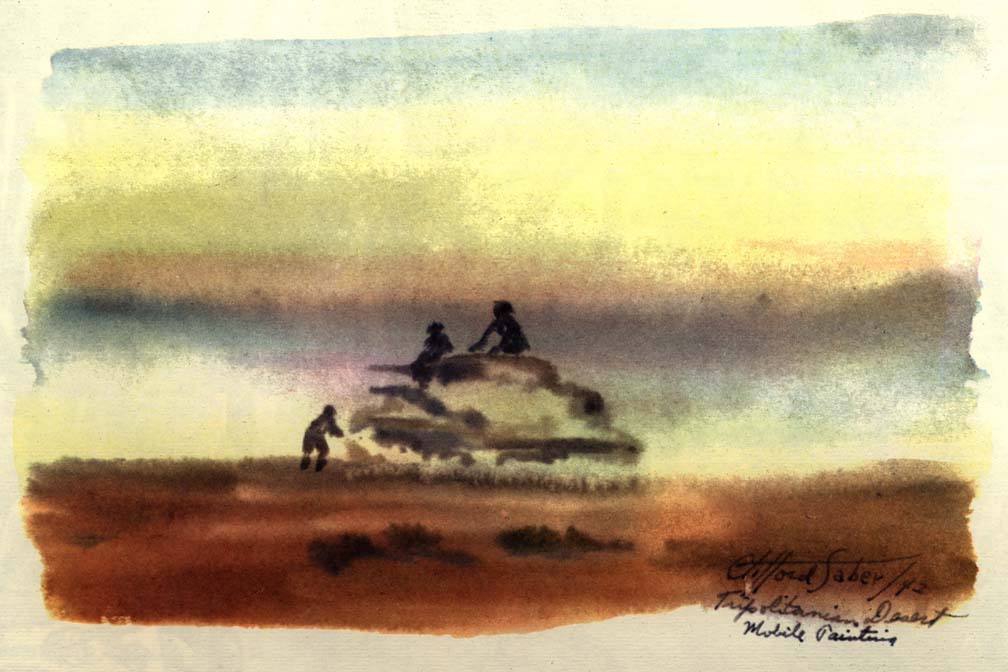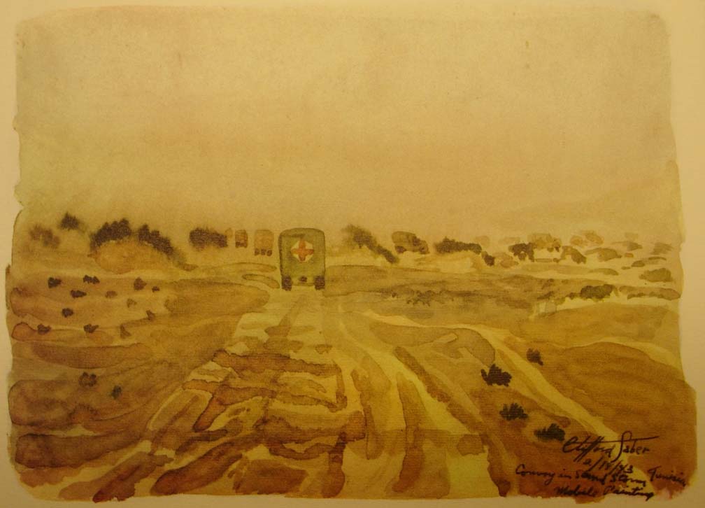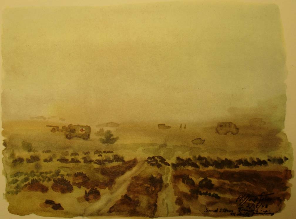 In convoy, while we plowed through a sandstorm, Wee Wee took over the wheel and gave me the opportunity while the light lasted to paint various phases of the storm on the move. We were entering enemy territory where the LRDG's had just made a reconnaissance. They had reported to Montgomery, giving him valuable information for his plan for the battle of the Mareth Line. We had the strange feeling that the eyes of 88 mm's were looking down on us from the Matmata Mountains on our left. We were never really scared when we were actually being shelled, bombed, or machine gunned, for we were too busy working, and then too you weren't alone, for no matter where you looked you saw other units and men close by. Now we were alone, going toward a spot where a month later the New Zealand Division with some 27,000 men and 200 tanks were to overcome the difficult terrain and enemy action by outflanking the Mareth Line to Hamma. As a lone moving brigade, with the thought of Jerry surrounding us, we became more uneasy the farther we penetrated his territory. The khamseen camouflaged us from the enemy but its intensity hid us from each other as well, and it was a job for Wee Wee to keep the ambulance ahead of us in sight.