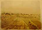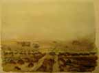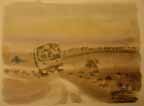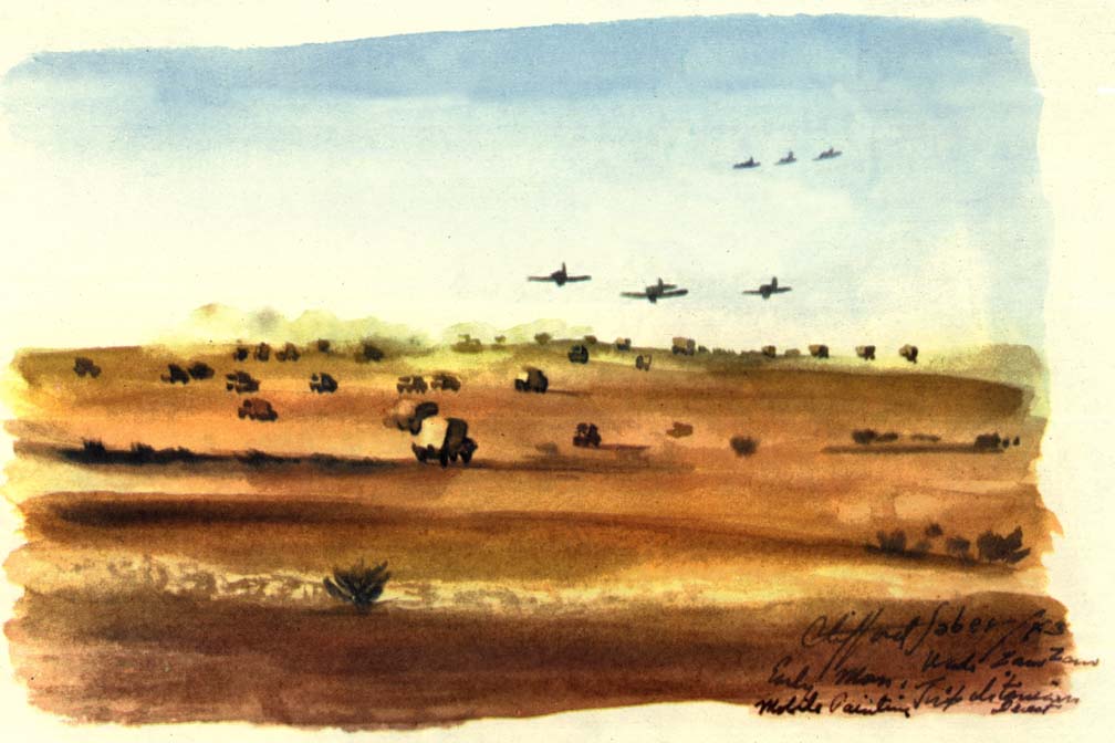 Our convoy, because of its size, moved slowly across the unknown terrain against the wind of sand. At one point, the visibility was so bad I stopped painting and we opened the oil- and sand-covered windshield. The sand and dust came at us with a driving force which surpassed any blizzard I had ever encountered in New England. Fog, mist, and sleet were treacherous for driving but this peppering of sand in all directions from one bit of desolation to another was damn-all. Nevertheless, we withstood the open-window sand blasting for a while for the sake of visibility.