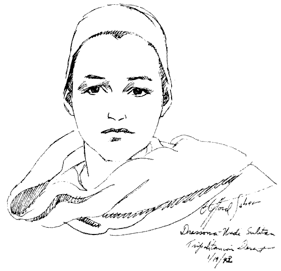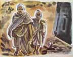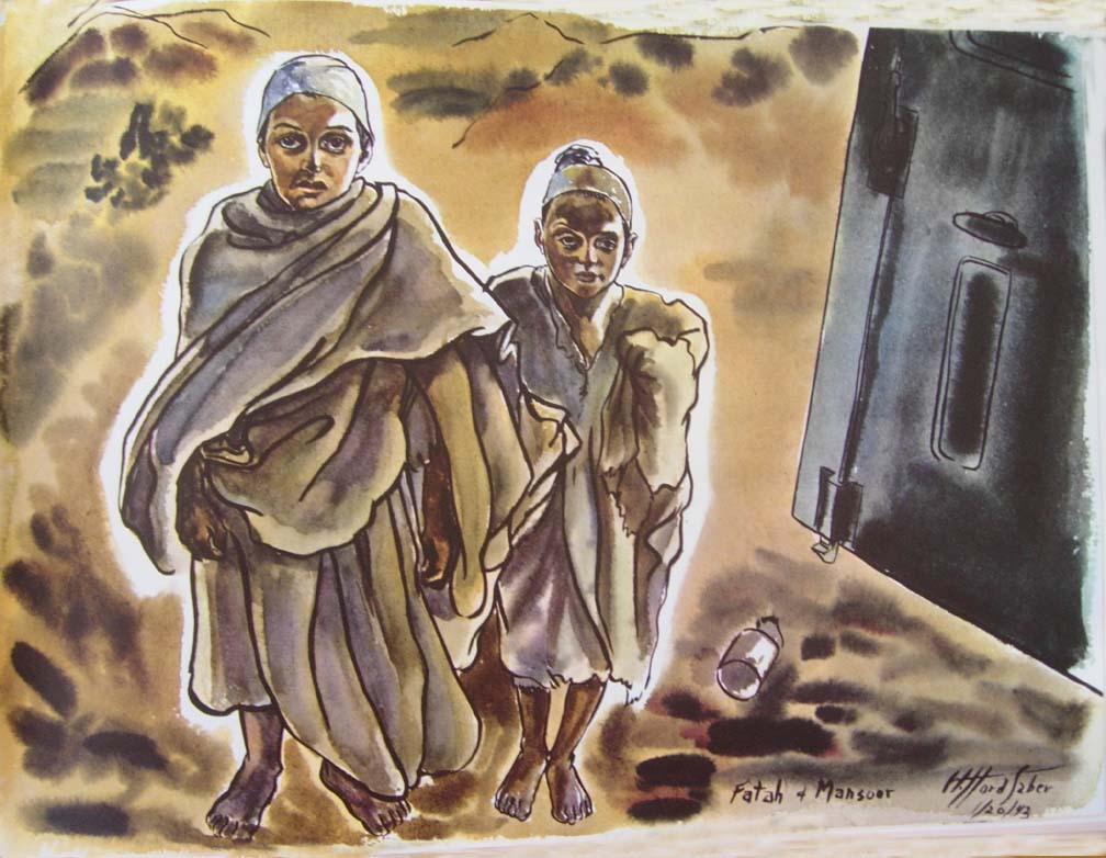 It was here that I met Fatah, a strong good-looking boy of ten with big brown eyes. I did two paintings of him, one with his smaller brother, Mansoor, who had an older person's facial features but lacked the vivacious personality that Fatah generated all over the camp. Mansoor had a way of tucking his arms into his tunic, and at first I had the impression that he was armless. It wasn't until I offered them both biscuits that the hidden hands and arms emerged to accept the food.