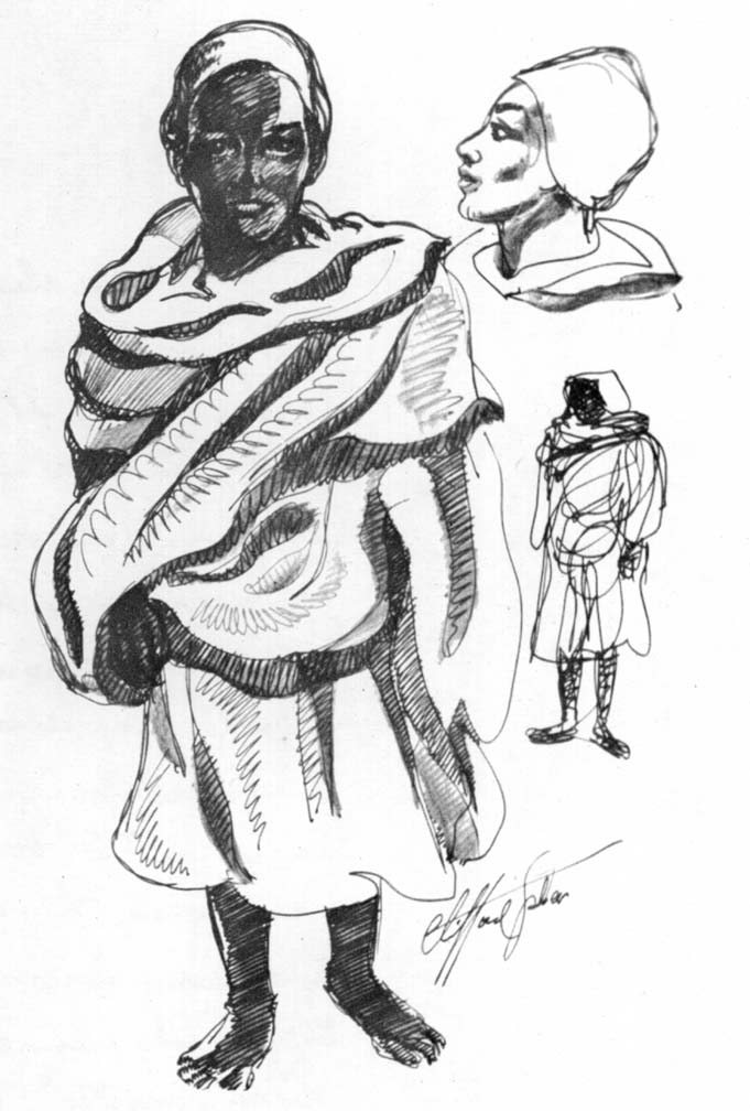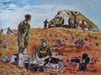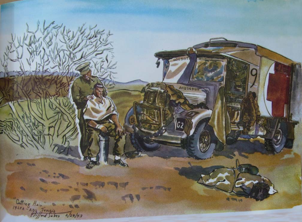 Our chance meeting on the desert with the guerrilla group was rare in a battle area. It was short and full of inquiries and not conducive to sketching. It was one of those times when our MDS of the 14th LFA was ahead of itself and its brigade and a month ahead of Montgomery's flanking movement at the Mareth Line. Also up in the surrounding Atlas Mountains Jerry's 88 mm's were looking down on us.