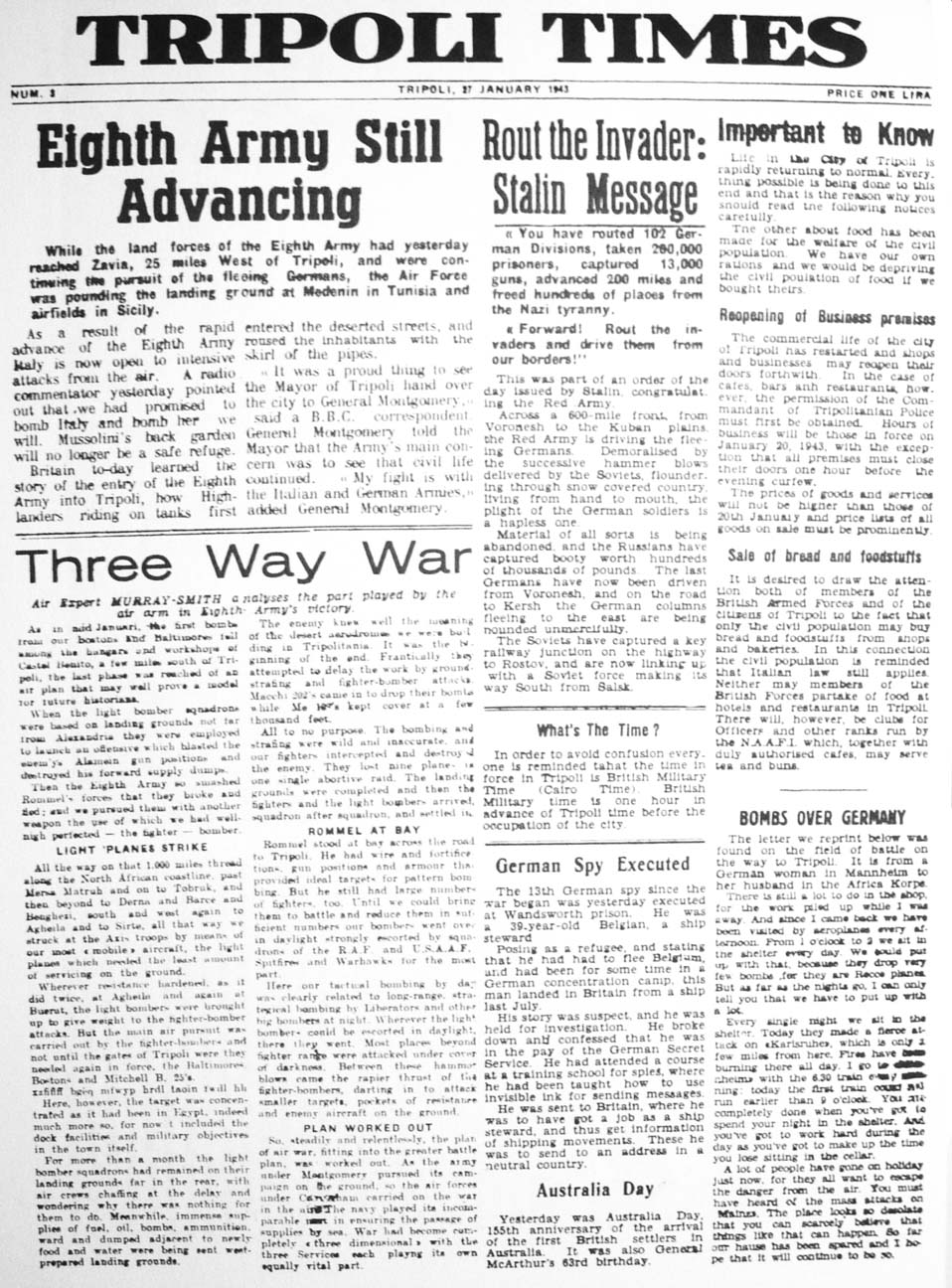 miles from Tripoli. Tripoli is the only town in the Italian Empire overseas still remaining in their possession. Therefore we will take it from them ... ON TO TRIPOLI! GENERAL MONTGOMERY'S dispatch to the troops,