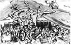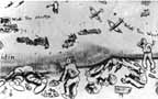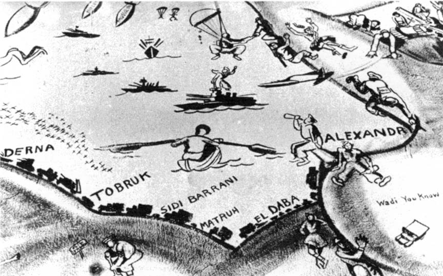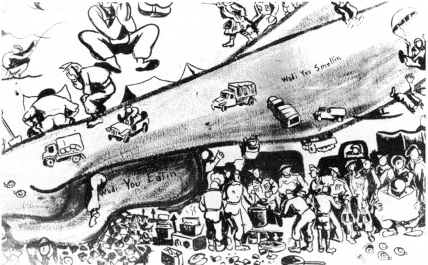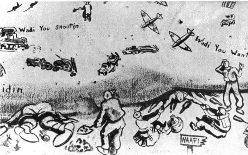 For the recreation room at Garian, I decided upon a super-duper nude encompassing the entire wall, 30 x 15 feet. Usually when a muralist works he uses a scale pattern of a small sketch or a photograph of the sketch projected onto the wall. He carefully traces this, insuring his proportions. In this case I had neither the time to make this sketch nor the means of projecting it. And to top it all - no scaffolding. I managed to get up by means of boxes, but this meant that my nose was rarely more than six inches away from the wall. Starting from the head, I worked down to the feet on this beautiful virgin wall. To this day I don't know how I kept the figure in proportion. When I stood back to inspect the completed figure, I found that the top outline of her body ironically coincided with the coastal line of North Africa. I marked her off as the Middle East from Tripoli (Lebanon) to Tripoli (Libya) and named parts of her body for nonexistent wadis: Wadi you hiding? Wadi you doing? Wadi you say? Wadi you know? Superimposed on her from Syria to Tunis were Lilliputian figures of the units, men, and doings of the 8th Army. Somewhere near the midriff is a blown-out German tank with the string of old boots tied behind and a caption on the back, "Just Married." Above her soared the RAF and American 9th Air Force whose eager men were parachuting onto her. Along with the confusion of armored cars, convoys, and slit-trench digging on her terrain was a key figure similar to the Kilroy of the U.S. Army. It was a little Tommy in a sitting position holding the inevitable stretched-out newspaper and shovel. He was among the parachutists, the infantry, the armored units, and even at chow call. Such was life in the desert.