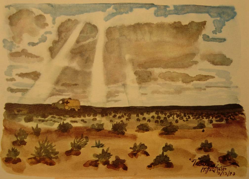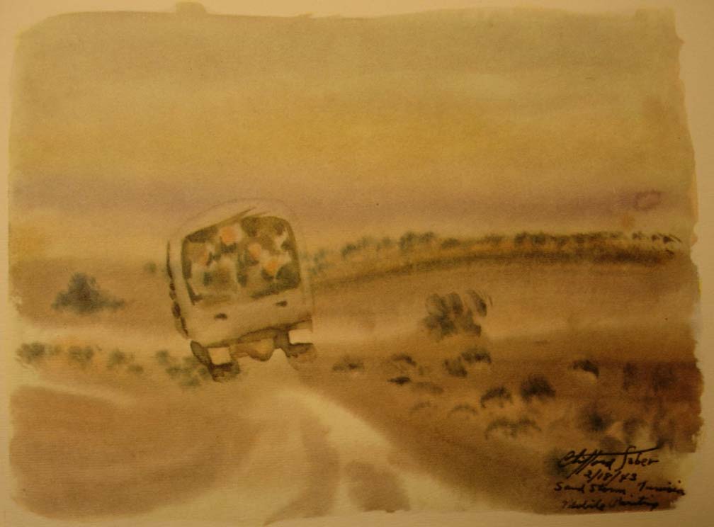 When the fury of the storm shifted away from in front of us, we closed the windshield. I started to paint again in the sandstorm, protected by the windows of the ambulance. It was an exciting mental stimulus which eliminated the strain of the storm's impact and the boring time of passing through it.