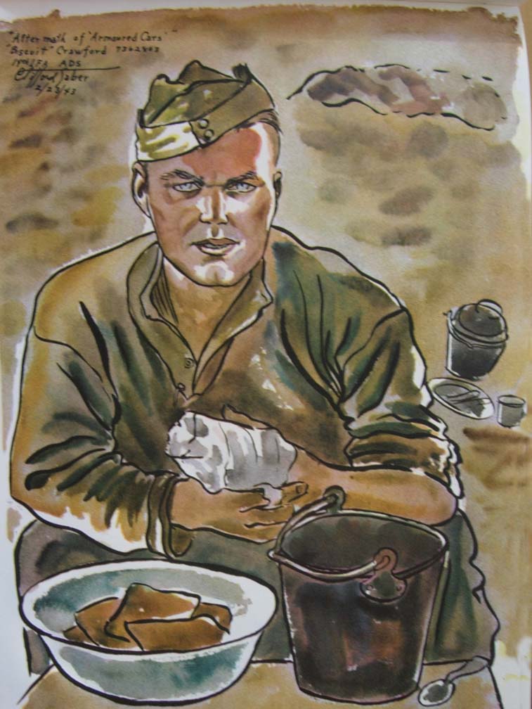 By doing a picture of some sort every day I started to hit my stride in the true water-color medium, the old French method of painting aquarelles --- that is, abstaining from the use of opaques. The most interesting were the operation scenes done in two-hour sittings. My recording was done with the team of Lieutenant Colonel Clifford Evans who was in command of the 14th LFA, and RAMC Surgeon Captain Samuel Vincent who became so enthralled watching me paint that he took up the art. Later when I returned to the States I sent him painting equipment for his tour of duty in Germany.