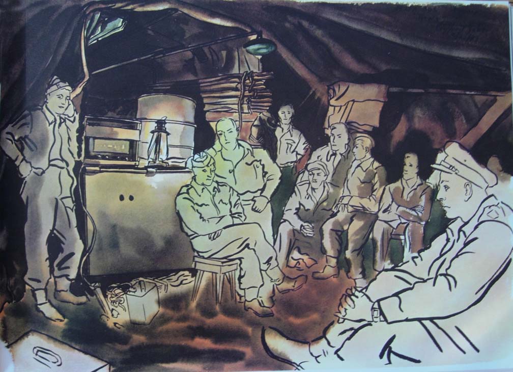 I also once tried to sketch a formation of attacking Folke-Wolfs in the very midst of actual close fire and bombing. My calculations said that a direct hit on this human ant were slim. Knowing it was nigh impossible, I gave it a try, if only to prove to myself whether or not the American magazines' fantastic war paintings "executed under fire" were grossly exaggerated or true. Perhaps some artists could stay out in the open and paint, impervious to bombs and bullets. As for myself, I can convey only a post mortem impression of myself dropping everything and running across open ground to dive into a slit trench next to the ambulance.