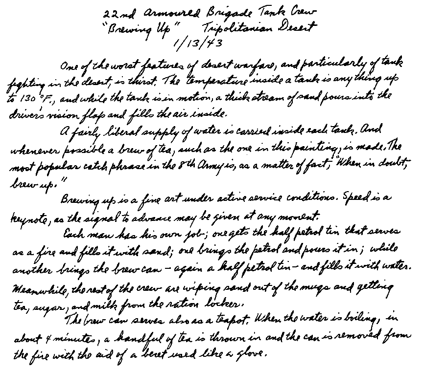 The gun itself certainly had had an interesting history, a taste of which I got that afternoon. It had seen service in France, during Wavell's Push, in the siege of Tobruck, and in the entire Western Desert campaign. Its crew was wiped out three times, once by shell fire, once by bombing, and once by machine-gun fire. Once when the gun was disabled and the crew casualties, Sergeant Owen moved the wounded back and pulled the gun away from a burning ammunition lorry. At the time I did the picture, which had a suède finish from the dust storm, he was up for a military medal. He was truly a Desert Rat.