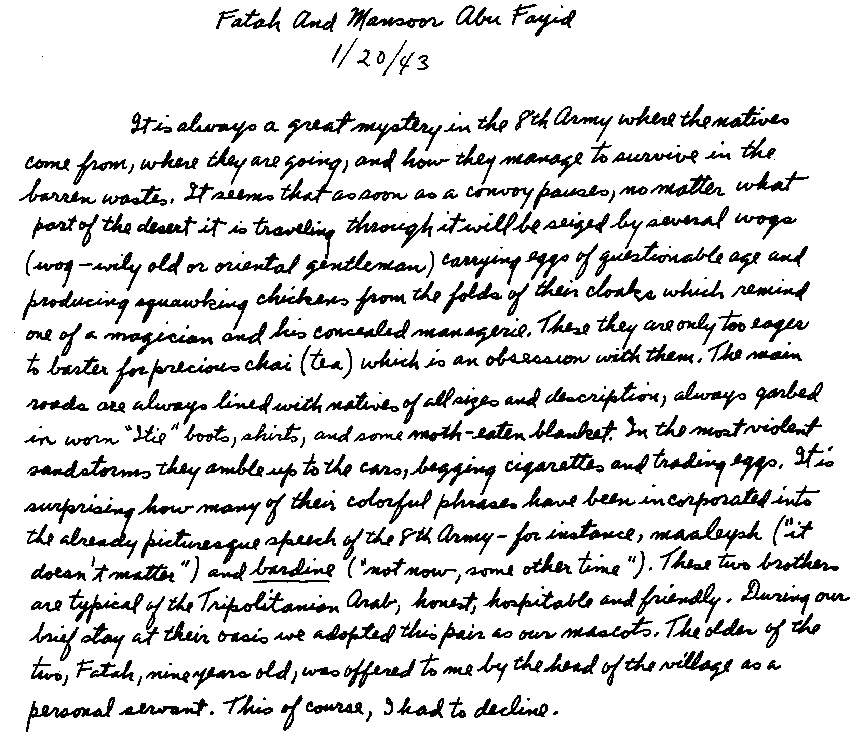 Fatah and I got to be pals. He followed me around like a shadow. He helped me wash and clean my mess tins in the sand. He took a delight in my shaving. When it came time to brush my teeth I offered him some of the toothpaste to clean his teeth which were quite stained; he tried it and at first couldn't stand the peculiar hot feeling of the soap and spit it out. He then became bolder and asked me for some more which I squeezed out for him. He aped my brush strokes with his forefinger. Although tears were in his eyes, the broadest smile was on his face. Tom Smith and "Boo Boo" Reynolds, who shared an ambulance together, and I were in stitches over his antics. Boo Boo was so taken by Fatah that he wrote a wonderful letter about him to his little niece back in Hartford in which I did a small pen drawing of Fatah.