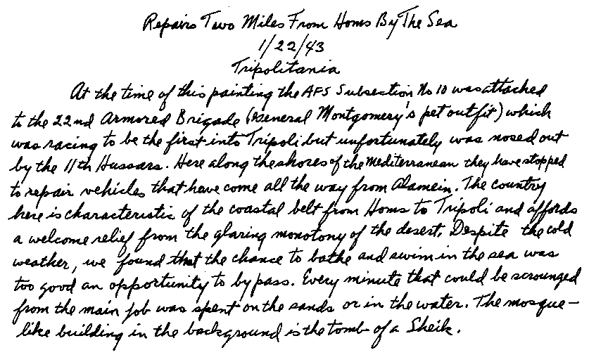 Sketching during the campaign and reporting what I saw was so challenging and so engrossing that during lulls of inactivity I lost all sense of time. I had many problems besides that of executing the work. One day I received permission to leave our campsite to go over to sketch a Bofore gun team who were lolling about in the Tunisian sun. I took a bearing on a mountain and walked a mile to get to them. In the midst of painting the weather changed and a small dust storm kicked up, raising havoc with paint and paper. I stopped work briefly for a brew-up and a chat with the Tommies until the wind died down. They were the No. 2 Detachment "B" Troop of the Royal Army Ack-Ack Battery. Just as I had resumed painting, the aircraft warning sounded and Messerschmidts came over. The crew were at their stations manning the gun in a matter of seconds. I dropped the sketch book, grabbed my steel helmet, and kept out of the way while the gun fired away. The suspense and tension were indescribable, for these guns were always the targets of Jerry, and to get them out of the way he resorted to bombing and low-level strafing. I was frightened out of my wits, but the crew were joking as they fired. One plane was downed and the RAF soon appeared and circled overhead. Trying to look nonchalant, I got back to painting, and concentrating on my subjects, I felt the terror I had known a few minutes before go out of me.