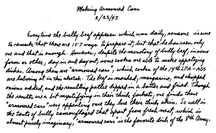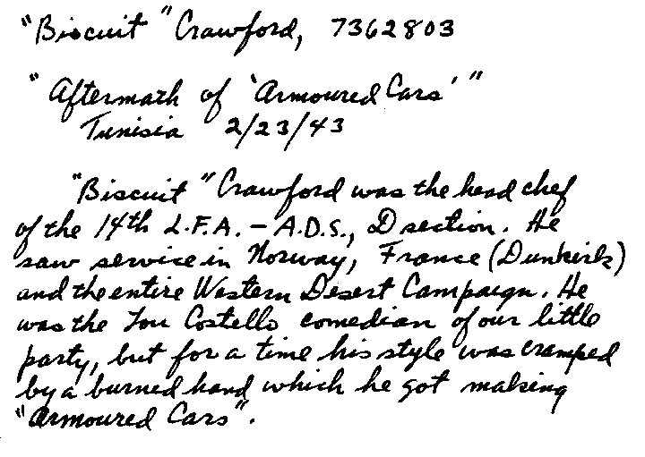 Their tams leaned rakishly over their sandy-red freckled Scottish faces, and their bruised stubby knees showed the wear of the terrain. To them all other soldiers were secondary. This was a war between them and Jerry. They were self-righteous individuals and without a doubt among the fiercest and most valiant fighters, especially with cold steel. As we talked, I kept remembering the spine-tingling wail of the bagpipes which played every sundown in the desert, as well as the chilling battle marches with accompanying drums when the Highland Division charged with bayonets and were practically wiped out. Jock and Chaur were browned off, for they had subsisted on short rations of nothing but cold bully beef and hardtack biscuits for three weeks, so they had finally come to the point of scrounging food. We remedied that on short order. We had a banquet!