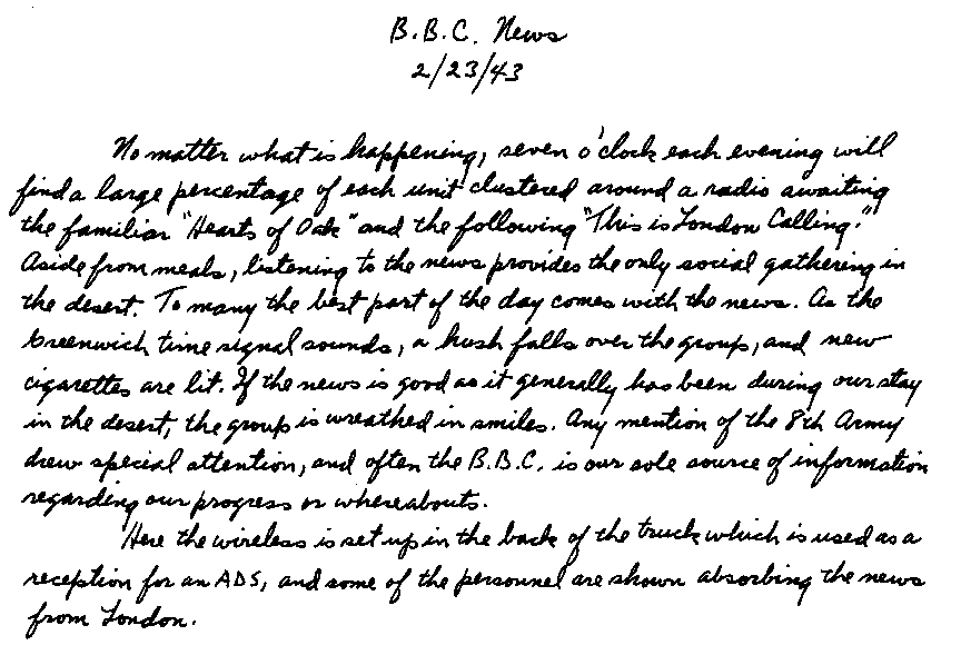 All along the line I met Arabs who would ask, "Have you seen my brother [or some other relative]? He was forced into the Italian army by bayonet point." Or, "He went to Benghazi with the Jerries, and when the British came escaped or joined up with them." These were the Senusi people. I had seen a few such soldiers along the line but didn't know whether they were prisoners or Allies. I soon learned that those poor Arabs who refused to fight for the Italians were shot, hanged, or bayoneted. Occasionally I heard of a few who dribbled back to their villages or camp after we had occupied Italian territory. Those with whom I spoke had hated the Axis. Their food had been bad and they had been put in front on many of the assaults. I was surprised to learn that 123,000 were forced into the army by sheiks who were in Italian pay. The families they had left behind were starving. Whatever good livestock or crops they had were taken by the Ities and Jerries. Their food rations were nil. They actually were existing on dates and what few eggs the chickens laid; as they said, "If the hens have something to eat, we have eggs." They had no tea, sugar, or flour. Meat was found only in villages where they had managed to hide their stock of goats and sheep when the Axis troops retreated.