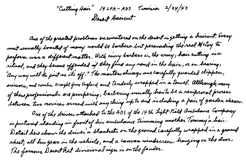 Whenever we received a hurried call for duty or a move to our next point, we had a hell of a time corralling the chickens. Usually Wee Wee had to climb on top of the ambulance and grab. After many days of trial and error, we devised a scheme as good as a Texas roundup system. As I opened the doors to the back of the ambulance Wee Wee chased the chickens in and I locked up the whole family. Patients lying in the back often said they thought they heard something that sounded like chickens cackling. When they were informed that they heard right, they lost the fear that something was wrong with them mentally. There were always questions about when we were going to eat our hens and why we were carrying them through miles and miles of desert. Our reply was --- for the day we met up with the Americans and the 1st Army and then ---good old southern-fried chicken.