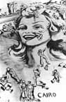 The colonel of the brigade came in with Lieutenant James Ullman. At the colonel's request I designed the stage and backdrop for this room and attached roof tiles from a blown-out building to wooden panels for a proscenium. For the background I painted a surrealist desert scene dominated by two large snails, surrounded by sagebrush, crawling along the coast road which was spanned by Marble Arch, the halfway point between Alexandria and Tunis. On top of the arch flew the Union Jack. Out of the clouds came three planes bearing the American flag; the ruins of Cyrenica were in the distance. All objects cast long Daliesque shadows across the sand. I did two other scenes, one depicting a Tommy waking up in a slit trench, being waited upon by luscious nudes serving steak and potatoes. The other was a Tommy sitting under a grape arbor, surrounded by beautiful nudes bearing jugs of wine, the Bacchus of the desert! Lieutenant Ullman avidly took pictures of my painting and of the finished murals, being very meticulous about angles, light, and so forth. He promised me prints for my scrapbook. When I saw him later in Cairo and asked him about them, he shamefacedly admitted that he must have been desert-happy at the time, for he had forgotten to put film in the camera.