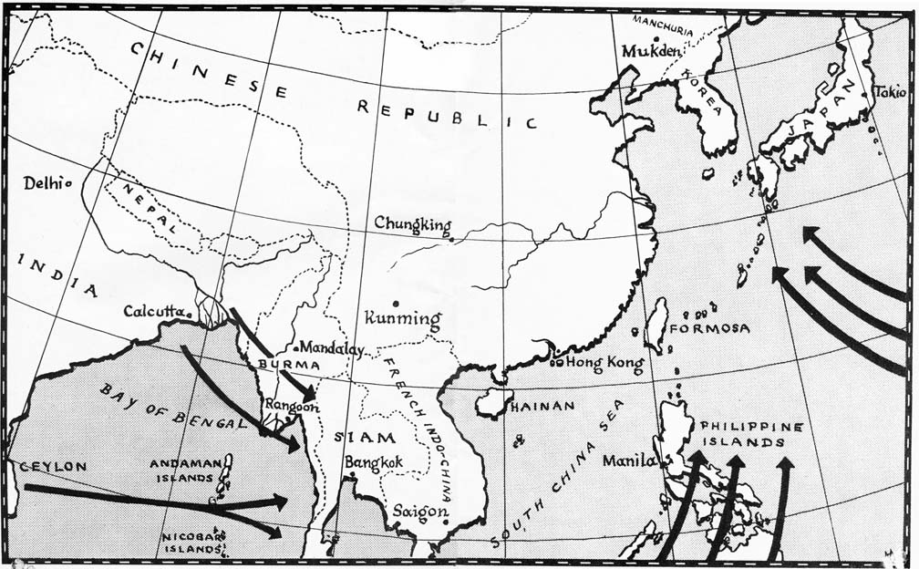 The first objectives of the Combined Chiefs of Staff in this theater were (1) to crack the Jap's land bastion defending his "co-prosperity sphere" in South East Asia, (2) to reopen communications to China from India, and (3) to crush the Japanese armies in Burma.