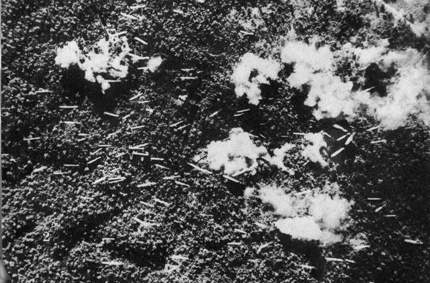 | How the Burmese jungles look to an R.A.F. pilot dropping incendiary bombs on Japanese stores hidden beneath the trees. |