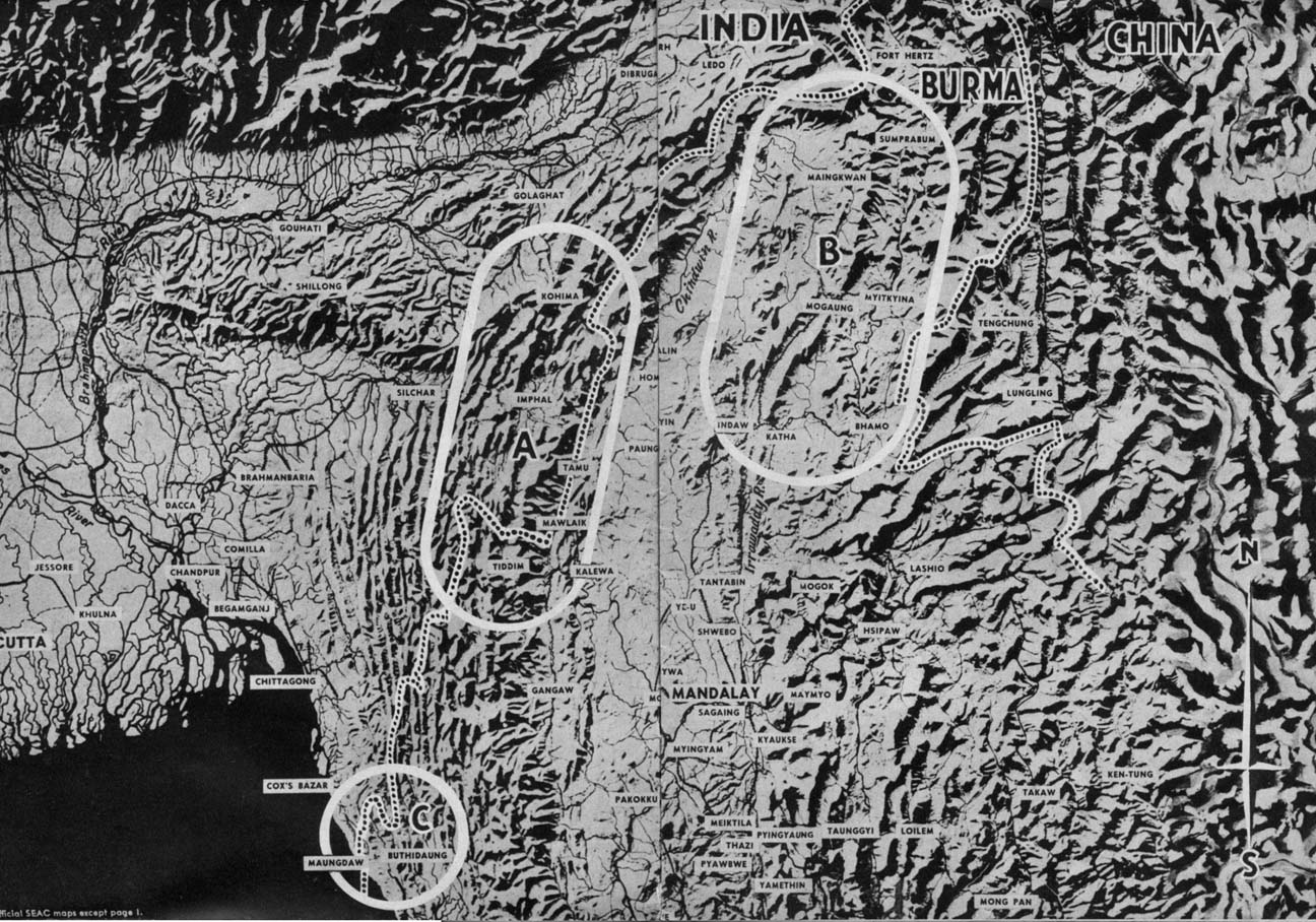 IN THE FACE of these reverses and convinced at last that their Imphal-Kohima offensive had failed, the Japanese High Command concentrated on holding actions. In Arakan they continued their regular strategy of trying to tie down as many British troops as possible with as few of their own, in Central Burma, aiming to extricate their beaten forces, they fought a series of stubborn delaying actions through country abounding in natural defensive positions. In the northeast their intention was to impose the maximum degree of delay upon Allied attempts to reopen the Burma Road.
