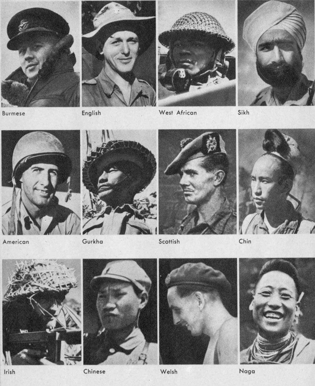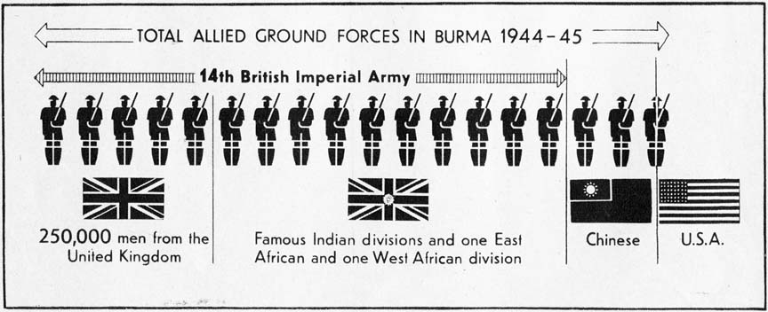 The forces deployed by General Leese in the operations leading to the fall of Mandalay and Rangoon were as follows: The 2nd and 36th British Divisions; nine Indian divisions (one-third of each being British troops)---the 3rd, 5th, 7th, 17th, 19th, 20th, 23rd, 25th, and 26th; three African divisions (officers and N.C.O's British)---the 81st and 82nd West African, the 11th East African. Besides these there were British Commandos, British armored formations, and British and Indian paratroops; also specialist and communication troops (gunners, engineers, signalers, medical, etc.). Meanwhile there were operating in the north three Chinese divisions and one American brigade.