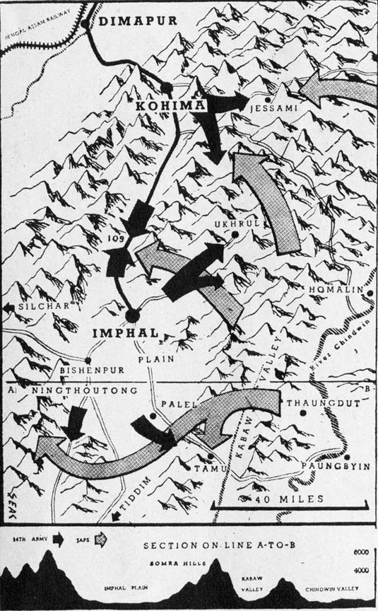 These dispositions were carried out according to plan. But there were two unexpected developments. First, the 17th Division (perhaps disliking withdrawals, however well planned) did not get back from Tiddim quick enough, so that the Japanese cut them off and they had to fight their way north. Second, the enemy were able to get no mere regimental group but an entire division into the attack on Kohima, thus heavily outnumbering its garrison and posing a fearful threat to the railroad only thirty miles to the northwest. If he could take Imphal, he would break the 14th Army. 1f he could take Kohima and the railroad he would cut off General Stilwell, strangle the Ledo Road and starve the airfields along the valley; and his troops would then swing westward along the Brahmaputra River to join the main advance into Bengal.