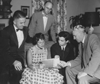 Rita Oila, Finnish AFS student, discusses the script with Peter Reynolds, actor, in the TV show "Two Worlds of Nicolo." John Plank, Culver High principal; I, as chairman of our AFS committee; and Jack Singer, Superintendent of Schools in Culver City, join in the discussion.