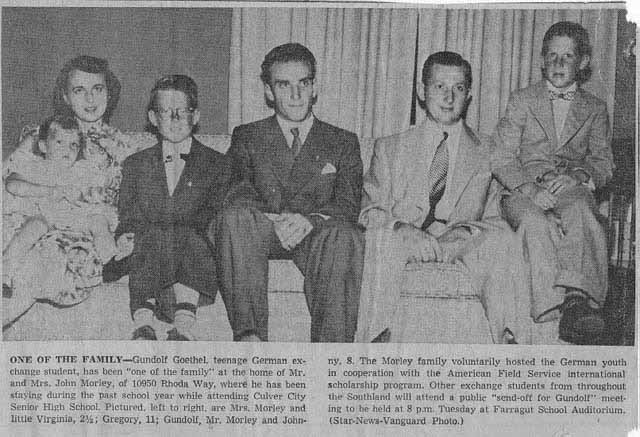 Gundolf Goethel was the student who came to live with the Morley family. We were very lucky to have started the AFS program in our high school with Gundolf Goethel and the John Morley family. Gundolf and his family were well suited to each other, and seemingly had few, if any, adjustment problems. Furthermore, during that year we became very good friends with the Morley's. Even though John, being an engineer and working for several different aircraft companies, moved his family a number of times through the years, we have always kept in touch and exchanged visits. Yes, we consider the Morley family among our dearest friends.
