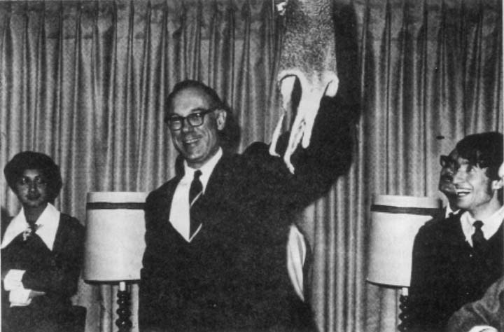 Mr. Arthur Howe, Jr. jubilantly displays the karakul sheepskin presented to him by Afghan Returnees at a reception in his honor during his visit to Kabul. Khalile Faqihzadh '68, Our World correspondent was the alert reporter.