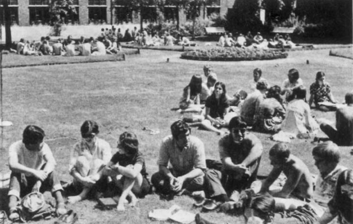 Gathered in circles on the lawn of Saint Ignatius University in Antwerp, 250 Americans Abroad "dug into discussion topics ranging from the high idealism of the organization to down-to-earth Returnee involvement," reports Belgian chaperone Cecilia Engels '67. Arthur Howe, Jr. and Jacques Contant, European Coordinator, were among the speakers at this end-of-year meeting.