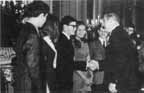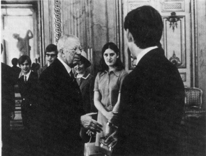 Former Chilean President Eduardo Frei gave a personal welcome to incoming 1970 Americans Abroad in June. He is shaking hands with Mark Chambers, one of the twenty students received at the Government Palace in Santiago.