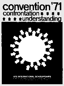 The arrows of "Confrontation and Understanding" theme of Convention '71---will lock into place at this global gathering, which proposes to give the whole AFS constituency a chance to listen to each other and discuss AFS goals. Behind the scenes action is gaining momentum as Director Val Sandberg and AFS Convention Chairmen throughout the world design and implement Convention '71 plans. Underway is a publicity campaign which, in utilizing the "Confrontation and Understanding" theme, features the symbol reprinted here in posters and brochures. Transportation is being arranged in many countries, and U.S. Chapters are planning reunions and anniversary celebrations to observe an AFS Week prior to Convention '71.