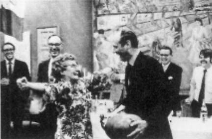 Jennifer Bott '67 writes that Joy Skelsey, former host sister, and Jenny Cearns '67 won the "Miss Goldfinger" and "Miss AFS" contests honoring fundraising and all-round attributes.